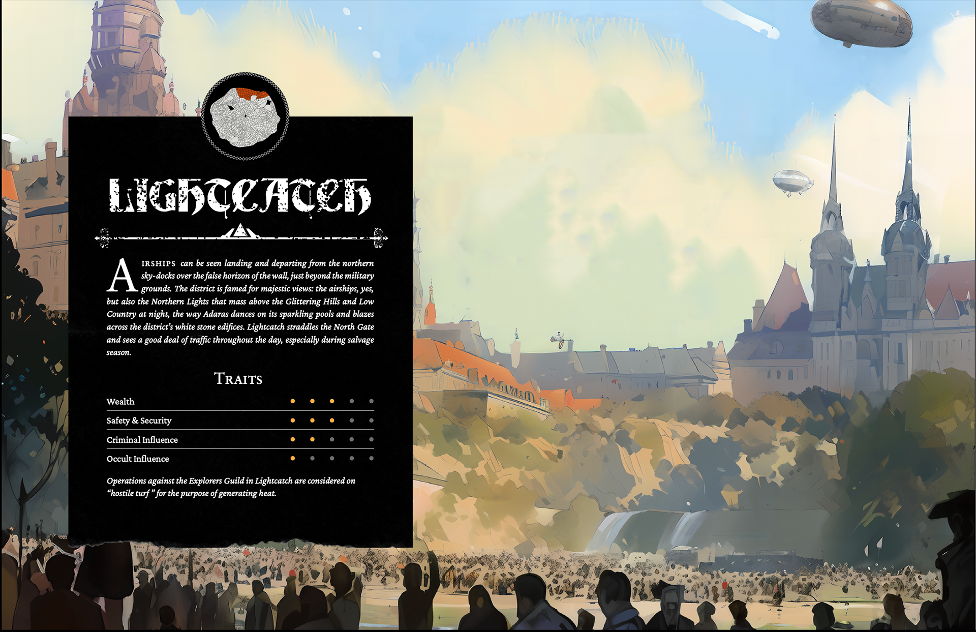 A pinup spread introducing the Ashstair district. One such spread was made for each of Hound's fourteen districts.